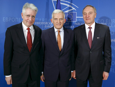 Briselē 2011.gada 11.janvārī: Latvijas Saeimas Eiropas lietu komisijas priekšsēdētājs Imants Lieģis un Tautsaimniecības, agrārās, vides un reģionālās politikas komisijas priekšsēdētājs Andris Bērziņš, tiekoties ar Eiropas Parlamenta priekšsēdētāju Ježiju Buzeku (centrā) Foto: Eiropas Parlaments |