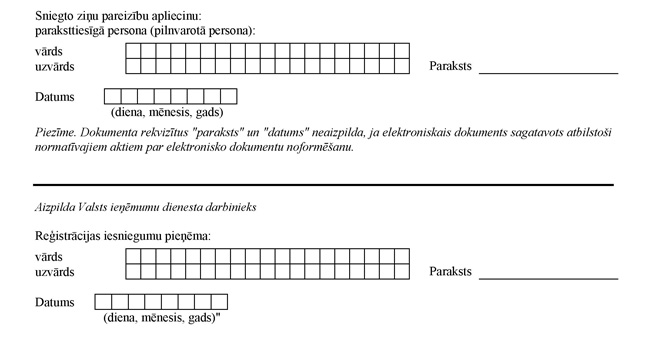 "40.2 Lai likuma 3.panta pirmās daļas 7.punktā minētā persona tiktu reģistrēta apliekamo personu reģistrā, tā iesniedz Valsts ieņēmumu dienestā reģistrācijas iesniegumu (5.pielikums). Minēto iesniegumu personai ir tiesības iesniegt arī elektroniski, izmantojot drošu elektronisko parakstu.";
