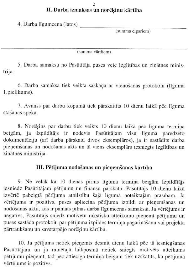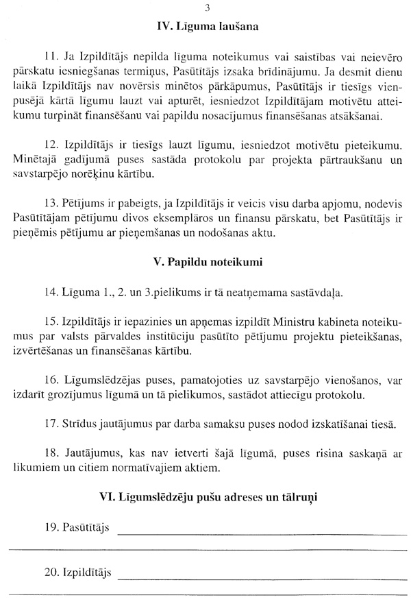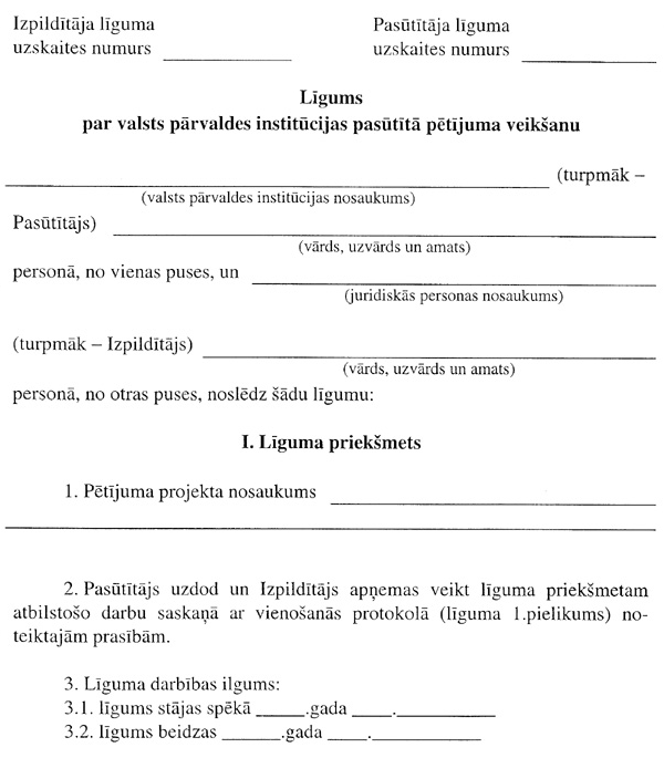 18. Institūcija iedalīto līdzekļu ietvaros slēdz ar pasūtījuma izpildītāju līgumu par valsts pārvaldes institūcijas pasūtītā pētījuma veikšanu (3.pielikums). Līguma darbības termiņš nosakāms ne ilgāks kā līdz kārtējā gada beigām.