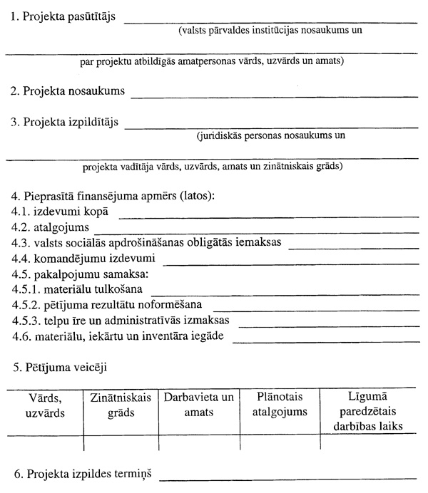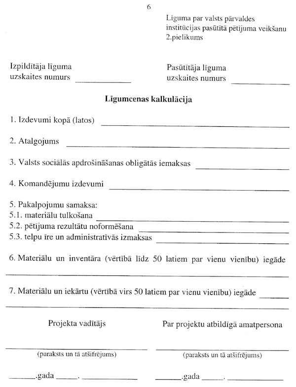 6. Pasūtījuma izpildītājs iesniedz institūcijā projekta pieteikumu, detalizētu finansējuma kalkulāciju un pētījuma veicēju sarakstu.