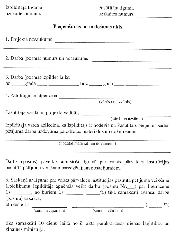26. Pamatojoties uz šo noteikumu 24.punktā minēto pētījumu, institūcija aizpilda informatīvo pārskatu par pasūtīto pētījumu (5.pielikums) un kopā ar pētījumu, pētījuma pieņemšanas un nodošanas aktu (6.pielikums) un pētījuma finansu pārskatu (7.pielikums) ne vēlāk kā līdz kārtējā gada 20.decembrim iesniedz Izglītības un zinātnes ministrijā.