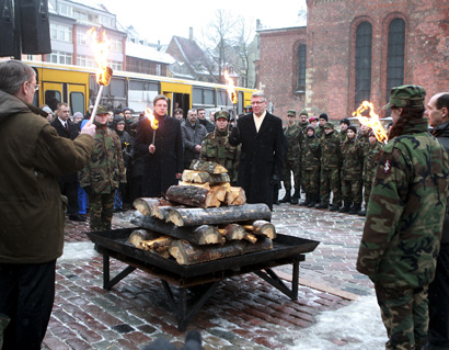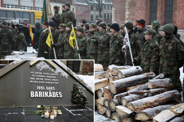 | Vakar, 20.janvārī, ar dažādiem atceres pasākumiem Latvija atzīmēja 1991.gada barikāžu aizstāvēšanas 20.gadadienu. Doma laukumā, no lāpām aizdedzot atmiņu ugunskuru: Barikāžu laika Tautas frontes priekšsēdētājs Romualds Ražuks, Rīgas mērs Nils Ušakovs, Valsts prezidents Valdis Zatlers, Barikāžu muzeja direktors Renārs Zaļais; pasākumā piedalījās arī Zemessardzes jaunsargi. Blakus – piemiņas zīme Barikāžu laikam pie Saeimas nama | |