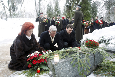 Noliekot ziedus II Meža kapos: Saeimas priekšsēdētāja Solvita Āboltiņa, Valsts prezidents Valdis Zatlers un Ministru prezidenta pienākumu izpildītājs vides aizsardzības un reģionālās attīstības ministrs Raimonds Vējonis |