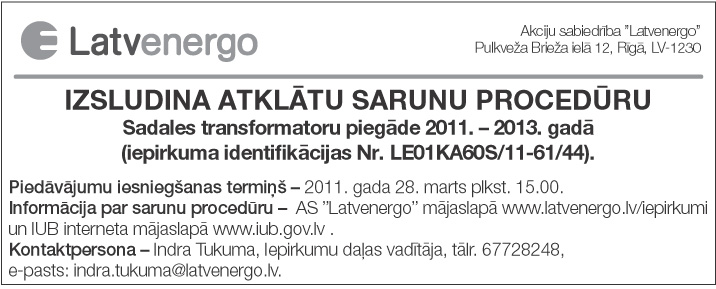Piegādes un darbu izpildes pasūtījumi. Publicēts oficiālajā laikrakstā "Latvijas Vēstnesis", 24.02.2011., Nr. 31 https://www.vestnesis.lv/ta/id/226318