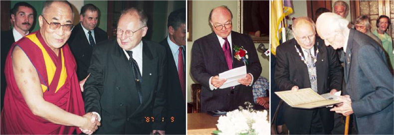 Augsti godātie viesi akadēmijas namā: Tibetas Dalailama, ASV vēstnieks Dž.Metloks un inženieris V.Caps – ar akadēmijas Senāta priekšsēdētāju J.Stradiņu |