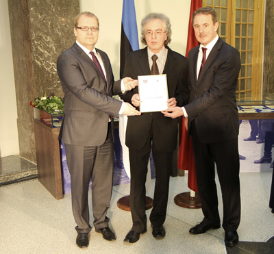 | Lai apspriestu Latvijas un Igaunijas divpusējo attiecību jautājumus, to skaitā ekonomiskās sadarbības stiprināšanu, Eiropas Savienības aktualitātes, sadarbību ar Krieviju un situāciju Baltkrievijā, vakar, 2.martā, Latvijā vienas dienas vizītē uzturējās Igaunijas ārlietu ministrs Urmass Paets (attēlā pa kreisi). Viesis tikās ar Latvijas ārlietu ministru Ģirtu Valdi Kristovski (attēlā pa labi), kā arī pasniedza Latvijas un Igaunijas ārlietu ministriju ikgadējo tulkojuma balvu par labāko latviešu un igauņu literatūras tulkojumu dzejniekam un tulkotājam Guntaram Godiņam (attēlā centrā). Saskaņā ar konkursa nolikumu šīs balvas pasniegšanu ik gadu pārmaiņus rīko Latvija vai Igaunija. Šogad konkurss notika jau otro reizi. Pirmo balvu 2010.gada martā saņēma tulkotāja Maima Grīnberga Foto: Ārlietu ministrija |