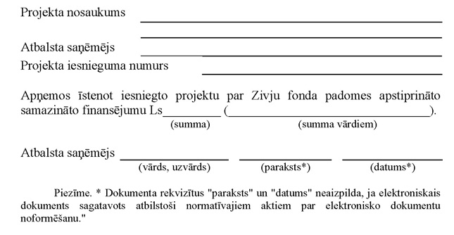 "14.1 Zivju fonda padome var pieņemt lēmumu par mazāka atbalsta apmēra piešķiršanu projekta īstenošanai, nekā pieprasīts projekta iesniegumā, ja Zivju fonda padome konstatē, ka projekta iesniegumā norādīto projekta mērķi ir iespējams sasniegt arī ar samazinātu atbalsta apmēru. Lēmums stājas spēkā, ja atbalsta saņēmējs 10 dienu laikā pēc tam, kad saņemts Zivju fonda padomes lēmums par projekta apstiprināšanu, iesniedz dienestā apliecinājumu par apņemšanos Zivju fonda atbalsta saņemšanai iesniegto projektu īstenot ar samazinātu finansējumu (turpmāk – apliecinājums) (4.pielikums). Apliecinājumu dienestā iesniedz personīgi, nosūta pa pastu vai elektroniski atbilstoši normatīvajiem aktiem par elektronisko dokumentu noformēšanu.