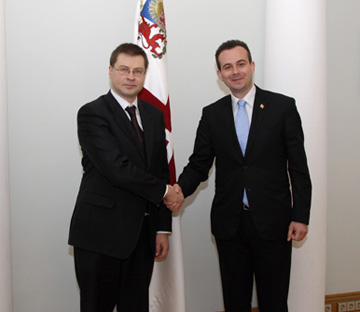 No 8. līdz 10.martam Latvijas Republikā darba vizītē uzturējās Maķedonijas premjerministra vietnieks Eiropas Savienības jautājumos Dr. Vasko Naumovskis. Vizītes ietvaros 9.martā V.Naumovskis tikās ar Latvijas Ministru prezidentu Valdi Dombrovski (attēlā), ārlietu ministru Ģirtu Valdi Kristovski, tikšanos laikā apspriežot valstu divpusējās attiecības, Maķedonijas integrācijas Eiropas Savienībā (ES) procesu, ES paplašināšanos un situāciju Rietumbalkānu reģionā, kā arī citas starptautiskās politikas aktualitātes Foto: Aivis Freidenfelds, VK |