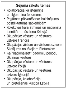 Par šo ļauno un nosodāmo sērgu kolaborāciju, kura 20.gs. vidū bija raksturīga vai visām Vecās pasaules tautām, kas cieta to vai citu iekarotāju jūgā, vēstī iznākušais Latvijas Vēsturnieku komisijas rakstu kārtējais, jau 26.sējums. Tam raksturīgas divas atšķirības no komisijas iepriekšējām publikācijām. Pirmā: liela ārzemju autoru – pavisam deviņu – klātbūtne (no Vācijas trīs, Krievijas, Igaunijas, Polijas, Beļģijas, Ukrainas un Holandes). Otrā: visus tos papildina īsāki vai garāki, lielākoties diskutabli, bet korekti Latvijas kolēģu komentāri, izņemot, protams, prof. Dr. Ineša Feldmaņa apceri, kuru labi paplašina Tartu Universitātes politoloģes Ph. D.Evas Klaritas Petai piebildes.