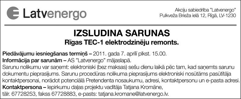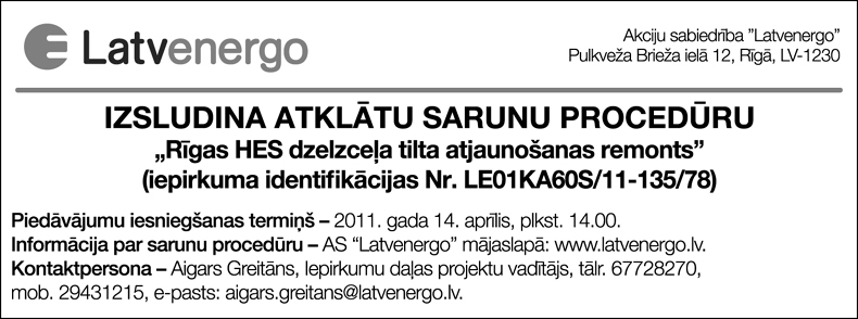 Piedāvājumu iesniegšanas termiņš: 08.04.2011. pulksten 14