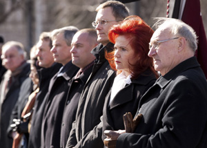 | Piektdien, 25.martā, Komunistiskā genocīda upuru piemiņas dienā, Latvijas tauta, valsts augstākās amatpersonas, deputāti dažādos pasākumos pieminēja no savām mājām svešumā aizvestos Latvijas cilvēku tūkstošus. Noliekot ziedus pie Brīvības pieminekļa (no labās): Politiski represēto apvienības vadītājs Gunārs Resnais, Saeimas priekšsēdētāja Solvita Āboltiņa, Ministru prezidenta pienākumu izpildītājs, finanšu ministrs Andris Vilks, Saeimas priekšsēdētājas biedrs Gundars Daudze, Saeimas sekretārs deputāts Kārlis Šadurskis, ārlietu ministrs Ģirts Valdis Kristovskis Foto: Saeimas kanceleja | |