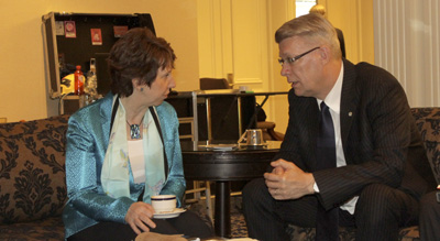Savukārt pēcpusdienā V.Zatlers tikās ar Eiropas Savienības augsto pārstāvi ārlietās un drošības politikā Ketrinu Eštoni (attēlā). Tikšanās laikā tika pārrunāta situācija Baltkrievijā. Abas amatpersonas pauda pārliecību, ka Baltkrievijai ir jāveic valsts politiskās sistēmas demokratizācija. Valsts prezidents atzīmēja, ka Latvija atbalsta Eiropas Savienības kopējo politiku Baltkrievijai, taču vienlaikus uzsvēra, ka Latvija atbalsta aktivitātes, kas ietekmē Baltkrievijas režīmu, nevis tautu. Tikšanās laikā Valsts prezidents izteica atbalstu pasākumiem, kas paver iespējas studētgribētājiem no Baltkrievijas mācīties Eiropas Savienības mācību iestādēs.