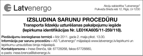 Piedāvājumu iesniegšanas termiņš: 2011.gada 29. aprīlis plkst. 12.00.