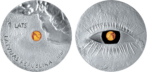 “Dzintara monētā” iekalts un iemūžināts minerāls, pusdārgakmens, ko radīja savulaik mūsu zemē augušās dzintara priedes un ko sīku akmentiņu veidā joprojām izskalo Baltijas jūra – ik monētā rūpīgā procesā iestrādāts dzintara gabaliņš. Pēc mākslinieka ieceres, dzintara cilindriņš tapis par acs zīlīti – monētas dizaina konkursā uzvarējušā A.Bikšes darba devīze bija “Un pēc 40 miljoniem gadu dzintars pirmo reizi ieraudzīja cilvēku…”