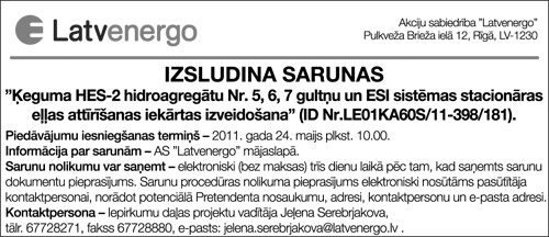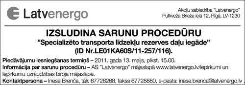 | Piedāvājumu iesniegšanas termiņš: | 2011.gada 3.maijs plkst. 12.00 |