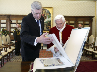 Latvijas Republikas Valsts prezidents Valdis Zatlers un Lilita Zatleres kundze no 13.–15.aprīlim uzturas oficiālā vizītē Vatikānā, kur 13.aprīlī apmeklēja Svētā Pētera bazilikas grotu, Vatikāna bibliotēku, bet vakar tikās ar Romas katoļu Baznīcas virspriesteri, Romas pilsētas bīskapu, Vatikāna valsts vadītāju pāvestu Benediktu XVI (attēlā) un Vatikāna valsts sekretāru Tarčisio Bertoni, kā arī sniedza interviju Vatikāna Radio. Valsts prezidents Latvijā atgriežas šodien, 15.aprīlī Foto: VPK |