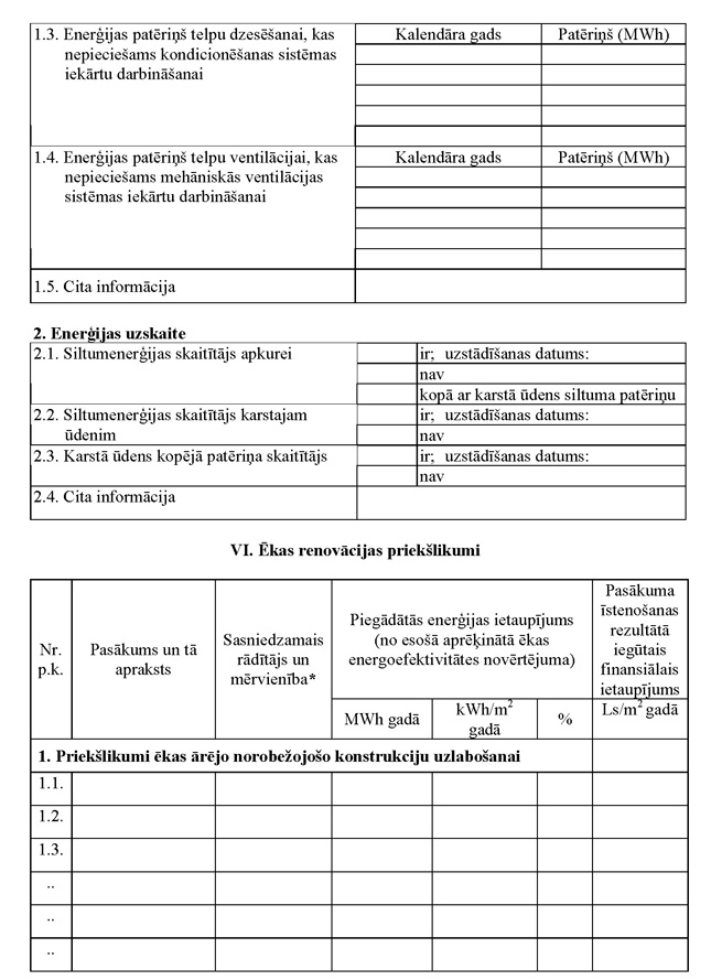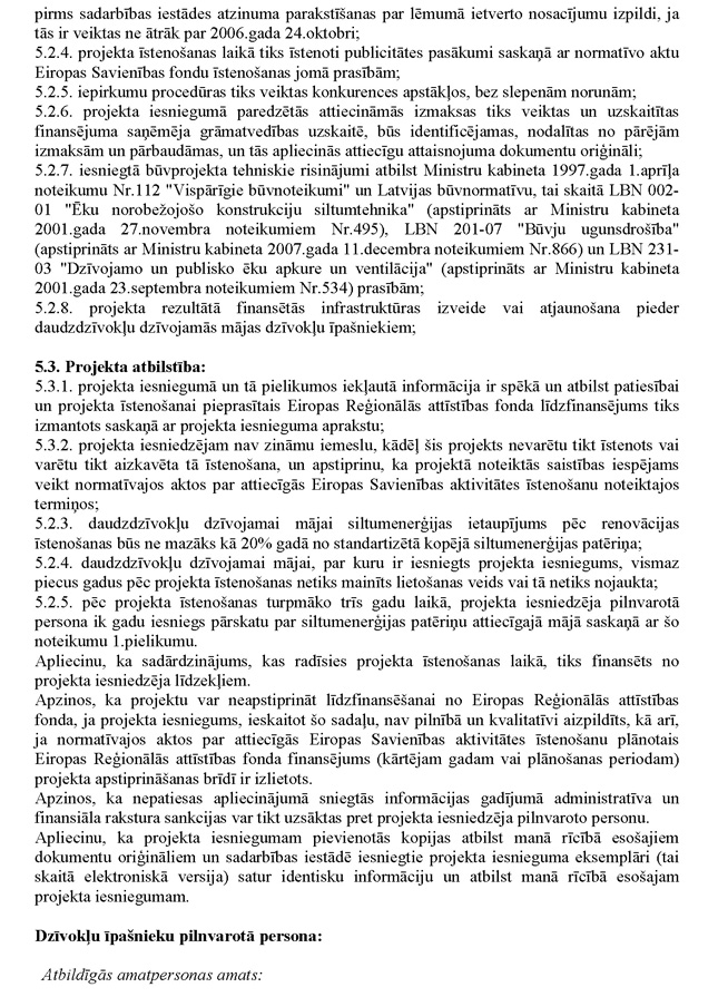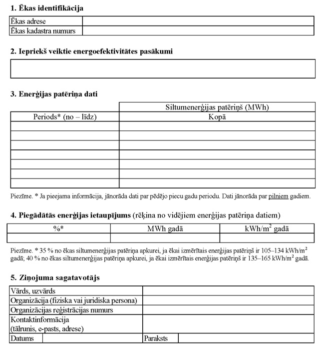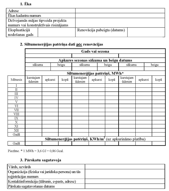 9. Projekta iesniedzēja pilnvarotā persona apliecina, ka pēc projekta īstenošanas turpmāko triju gadu laikā tā katru gadu, ievērojot līgumā par projekta īstenošanu noteiktos termiņus, iesniegs sadarbības iestādē pārskatu par siltumenerģijas patēriņu pēc būvdarbu veikšanas (1.pielikums) attiecīgajā daudzdzīvokļu dzīvojamā mājā.