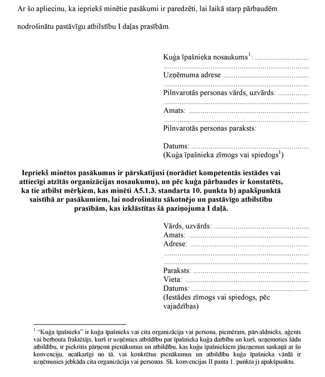 Paziņojumu parakstījusī persona kompetentās iestādes vārdā apstiprina, ka: