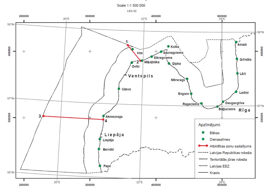 Piezīme. Rīgas ostas atbildības rajons ir Latvijas ūdeņi uz A no līnijas, kas savieno punktus 1 un 2. Ventspils ostas atbildības rajons ir Latvijas ūdeņi starp līniju, kas savieno punktus 1 un 2, un līniju, kas savieno punktus 3 un 4. Liepājas speciālās ekonomiskās zonas pārvaldes atbildības rajons ir Latvijas ūdeņi uz S no līnijas, kas savieno punktus 3 un 4."