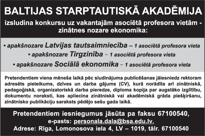 Pieteikuma dokumenti (motivēts pieteikums, CV un izglītību apliecinošu dokumentu kopijas) 20 kalendāro dienu laikā no sludinājuma publicēšanas jāiesniedz vai jānosūta Ekonomikas ministrijai: pasts@em.gov.lv, Brīvības ielā 55, Rīgā LV-1519, fakss 67280882. Uzziņas pa tālr. 67013183.
