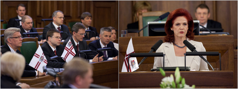 Saeimas priekšsēdētāja Solvita Āboltiņa (attēlā pa labi) Latvijas Republikas Neatkarības deklarācijas pasludināšanas 21.gadadienas svinīgajā sēdē, uzrunājot Saeimas deputātus, (attēlā pa kreisi) Valsts prezidentu Valdi Zatleru, valdības pārstāvjus, tostarp Ministru prezidentu Valdi Dombrovski, finanšu ministru Andri Vilku, aizsardzības ministru Arti Pabriku, ārvalstu diplomātiskā korpusa pārstāvjus, kā arī citus lūgtos viesus Foto: Saeimas kanceleja |