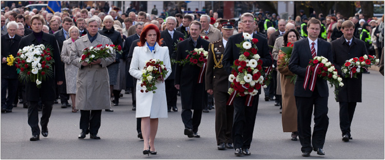 Vakar, 4.maijā, ar ekumenisko dievkalpojumu Sv.Jēkaba katedrālē, Saeimas svinīgo sēdiun ziedu nolikšanas ceremoniju pie Brīvības pieminekļa, kurā kopā ar tautu un ārvalstu viesiem piedalījās Saeimas deputāti, valsts un pilsētas augstākās amatpersonas, tostarp (attēlā no kreisās) Rīgas domes priekšsēdētājs Nils Ušakovs, Saeimas sekretārs Kārlis Šadurskis, Saeimas priekšsēdētāja Solvita Āboltiņa, ārlietu ministrs Ģirts Valdis Kristovskis, Valsts prezidents Valdis Zatlers, Ministru prezidents Valdis Dombrovskis, Saeimas priekšsēdētājas biedrs Andrejs Klementjevs, kā arī daudziem citiem pasākumiem pilsētas parkos un kultūras iestādēs Rīgā tika atzīmēta Latvijas Republikas Neatkarības deklarācijas pasludināšanas 21.gadadiena Foto: Saeimas kanceleja |