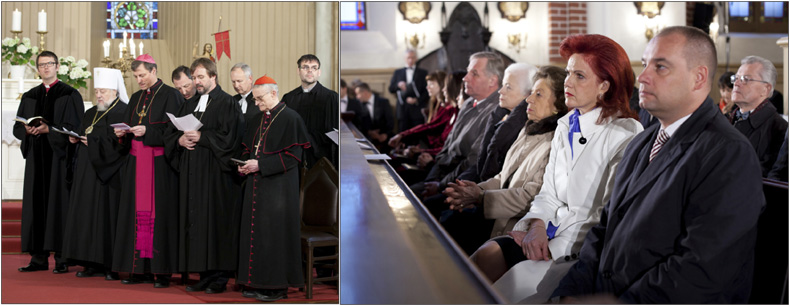Saeimas priekšsēdētāja Solvita Āboltiņa, Saeimas priekšsēdētājas biedrs Gundars Daudze (attēlā pa labi), citi Saeimas un valdības pārstāvji kopā ar tautu kopīgā aizlūgumā par Latvijas valsti un tās iedzīvotājiem Latvijas Baptistu draudžu savienības bīskapa Pētera Sproģa, Latvijas pareizticīgo Baznīcas Rīgas un visas Latvijas metropolīta Aleksandra, Romas katoļu Baznīcas Rīgas arhibīskapa metropolīta Zbigņeva Stankeviča, Latvijas Evaņģēliski luteriskās Baznīcas arhibīskapa Jāņa Vanaga un Romas katoļu Baznīcas kardināla Jāņa Pujata (attēlā pa kreisi) vadītajā ekumeniskajā dievkalpojumā Sv.Jēkaba katedrālē Foto: Saeimas kanceleja |