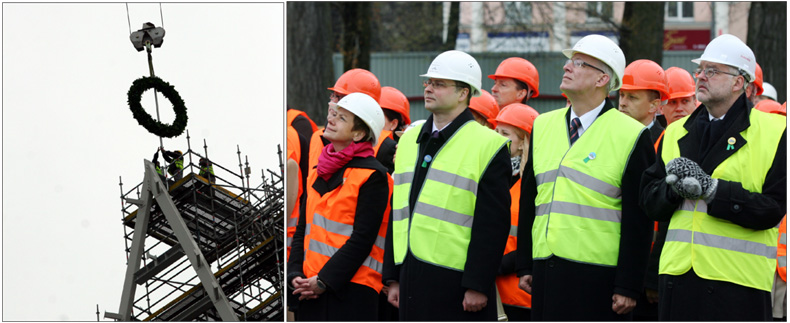 Otrdien, 3.maijā, Latvijas Nacionālās bibliotēkas ēka – Gaismas pils – svinēja spāru svētkus, kuros kopā ar celtniekiem piedalījās arī (attēlā no labās) Latvijas Nacionālās bibliotēkas direktors Andris Vilks, Valsts prezidents Valdis Zatlers, Ministru prezidents Valdis Dombrovskis un kultūras ministre Sarmīte Ēlerte. Savukārt vakar, 4.maijā, Latvijas Nacionālās bibliotēkas darbinieki un būvnieki no pulksten 13 līdz 16 visiem interesentiem piedāvāja iespēju aplūkot jauno ēku no līdz šim neierasta skatu punkta – tika atvērti būvniecības žoga vārti un interesenti varēja ielūkoties ēkas būvlaukumā Foto: VK; VPK |