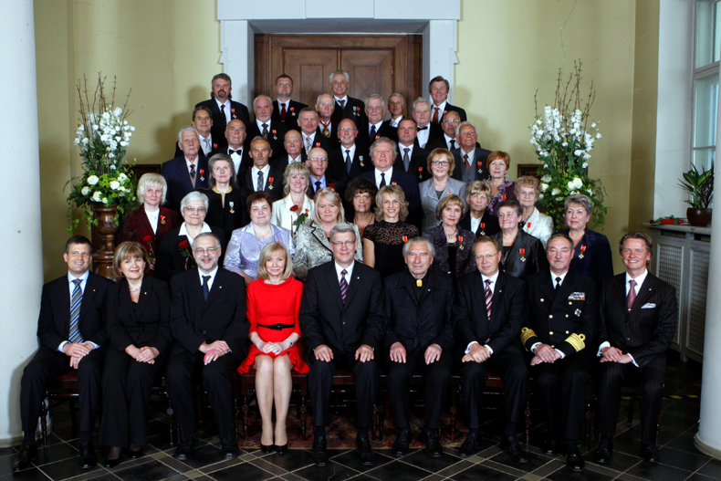 Otrdien, 3.maijā, Latvijas Republikas Neatkarības deklarācijas pasludināšanas gadadienas priekšvakarā Rīgas pils Ģerboņu zālē notika Latvijas valsts apbalvojumu – Triju Zvaigžņu ordeņa un Atzinības krusta – pasniegšanas ceremonija. Attēlā: (pirmajā rindā no kreisās) Ordeņu kapitula locekļi Toms Baumanis, Dace Gardovska, Ordeņu kapitula kanclers Andris Vilks, Valsts prezidenta kundze Lilita Zatlere, Valsts prezidents Valdis Zatlers, Ordeņu kapitula locekļi Ēriks Hānbergs, Juris Binde, Gaidis Andrejs Zeibots un Toms Kalniņš kopā ar apbalvotajiem Foto: VPK |
