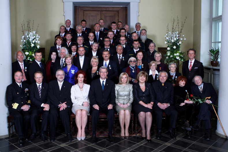 Trešdien, 4.maijā, Latvijas Republikas Neatkarības deklarācijas pasludināšanas 21.gadadienā Rīgas pils Ģerboņu zālē notika Latvijas valsts apbalvojumu – Triju Zvaigžņu ordeņa, Viestura ordeņa un Atzinības krusta – pasniegšanas ceremonija. Attēlā: (pirmajā rindā no kreisās) Ordeņu kapitula locekļi Gaidis Andrejs Zeibots, Juris Binde, Ordeņu kapitula kanclers Andris Vilks, Saeimas priekšsēdētāja Solvita Āboltiņa, Valsts prezidents Valdis Zatlers, Valsts prezidenta kundze Lilita Zatlere, Ordeņu kapitula locekļi Dace Gardovska, Ēriks Hānbergs, Toms Baumanis (2.rindā otrais no kreisās) un Toms Kalniņš (2.rindā pirmais no labās) kopā ar apbalvotajiem Foto: VPK |
