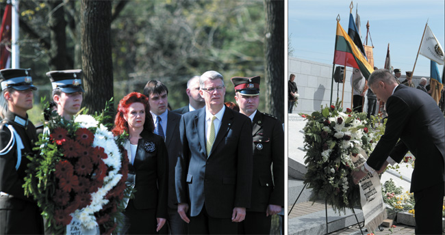 Svētdien, 8.maijā, ar ziedu nolikšanas ceremoniju, kurā kopā ar Latvijas iedzīvotājiem un valsts amatpersonām piedalījās arī Latvijas Valsts prezidents Valdis Zatlers un Saeimas priekšsēdētāja Solvita Āboltiņa (attēlā pa kreisi), tāpat kā citur Eiropā un pasaulē, Latvijā tika atzīmēta Nacisma sagrāves un Otrā pasaules kara upuru piemiņas diena. Savukārt aizsardzības ministrs Artis Pabriks nolika ziedus arī Tukuma novada Džūkstes pagasta kapos Otrā pasaules karā kritušo vācu karavīru apbedījumos un padomju armijas kapos, kā arī Lestenes Brāļu kapos piedalījās nacionālo partizānu piemiņas plākšņu atklāšanas svētbrīdī (attēlā pa labi). Foto: VPK; Gatis Dieziņš, RJC