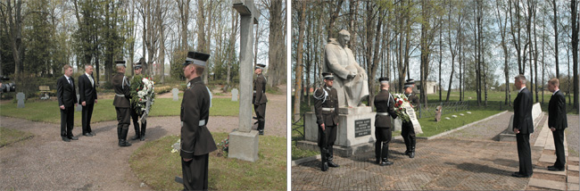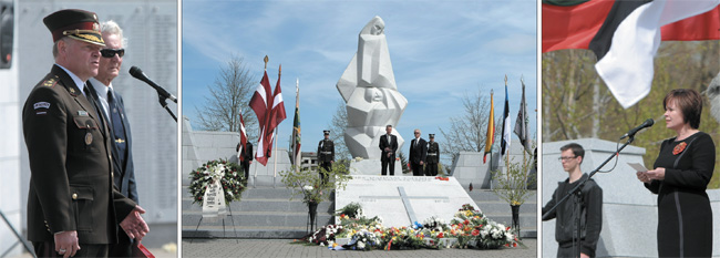 Svētdien, 8.maijā, Lestenes Brāļu kapos nacionālo partizānu piemiņas plākšņu atklāšanas svētbrīdī, kurā piedalījās aizsardzības ministrs Artis Pabriks (vidējā attēlā), kā arī Nacionālo bruņoto spēku komandieris ģenerālmajors Raimonds Graube, Latvijas Nacionālo partizānu apvienības valdes priekšsēdētājs Ojārs Stefans (attēlā pa kreisi) un Lietuvas aizsardzības ministre Rasa Juknevičiene (attēlā pa labi)