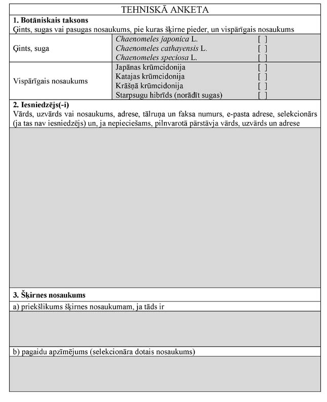 3. Šķirnes pārbaudes tehnisko anketu (2.pielikums) iesniedz institūcijai, kurai saskaņā ar normatīvajiem aktiem par šķirnes atšķirīguma, viendabīguma un stabilitātes pārbaudi ir tiesības veikt šķirnes atšķirīguma, viendabīguma un stabilitātes pārbaudi krūmcidonijām.