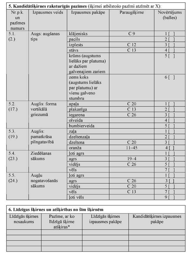 6. Lai novērtētu šķirņu atšķirīgumu, no pārbaudāmā materiāla iegūst vismaz divas augļu ražas, tā konstatējot atšķirīgas pazīmes no vispārzināmām šķirnēm.
