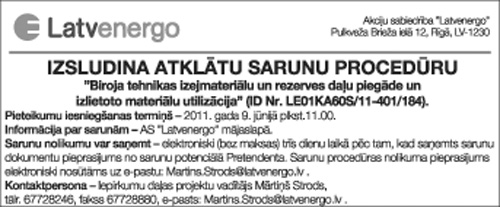 Piedāvājumu iesniegšanas pēdējais termiņš: 2011.gada 10.jūnijs plkst. 12.