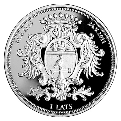 Monētas priekšpuse (averss): Centrā grāfa Ernsta Johana Bīrona ģerbonis no Rundāles pils pamatakmens plāksnes meta (Rundāles pils arhitekta Frančesko Bartolomeo Rastrelli (1700–1771) zīmējums), augšā puslokā pa kreisi datums 24.V.1736, pa labi – 24.V.2011. Zem ģerboņa puslokā uzraksts 1 LATS. |