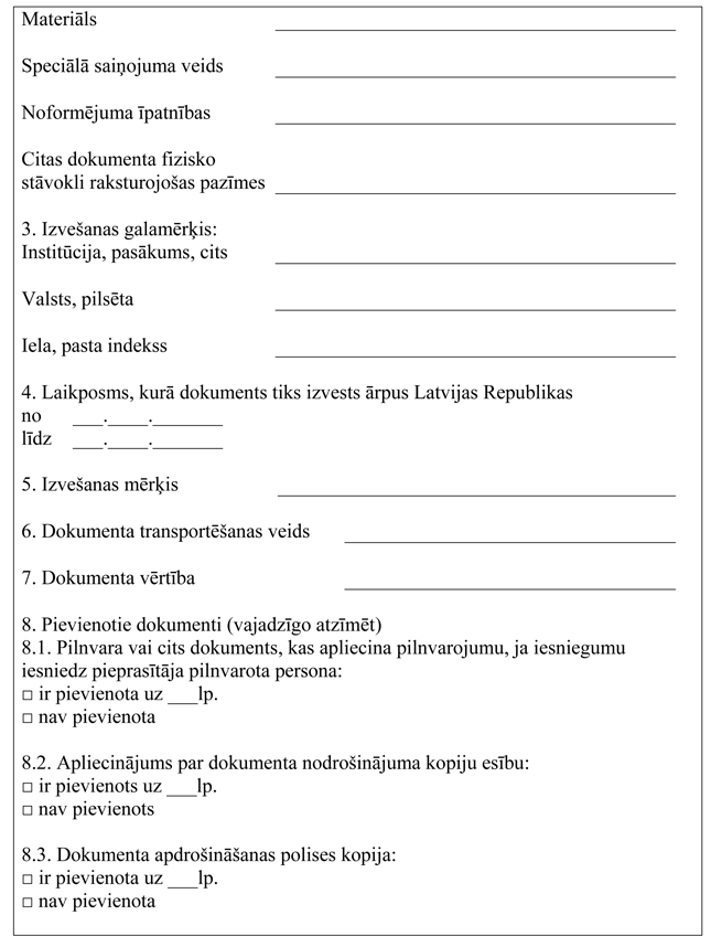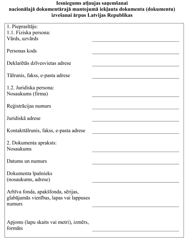 3. Lai saņemtu atļauju, privātpersona vai institūcija (turpmāk – pieprasītājs), vai pieprasītāja pilnvarota persona iesniedz Latvijas Nacionālajā arhīvā iesniegumu atļaujas saņemšanai (1.pielikums) un apdrošina nacionālajā dokumentārajā mantojumā iekļauto dokumentu.