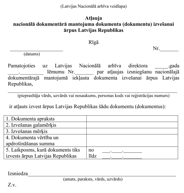 7. Ja pieņemts lēmums atļaut izvest nacionālajā dokumentārajā mantojumā iekļauto dokumentu, Latvijas Nacionālais arhīvs sagatavo atļauju (2.pielikums) divos eksemplāros. Vienu atļaujas eksemplāru kopā ar pieprasījumu glabā Latvijas Nacionālajā arhīvā, bet otru izsniedz pieprasītājam uzrādīšanai pēc attiecīgo amatpersonu vai iestāžu pieprasījuma.