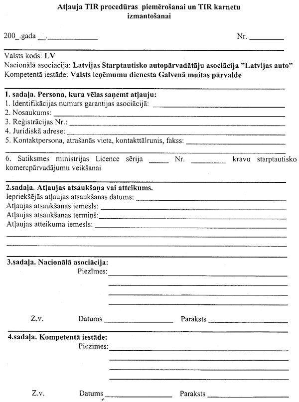 1. LSAA iesniedz VID GMP veidlapu "Atļauja TIR procedūras piemērošanai un TIR karnetu izmantošanai" (pielikumā), kurā LSAA aizpilda 1., 2. un 3. sadaļu: