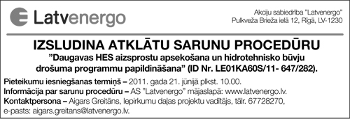 Piedāvājums un tam pievienotie dokumenti tiek pieņemti līdz 2011.gada 2.augustam.