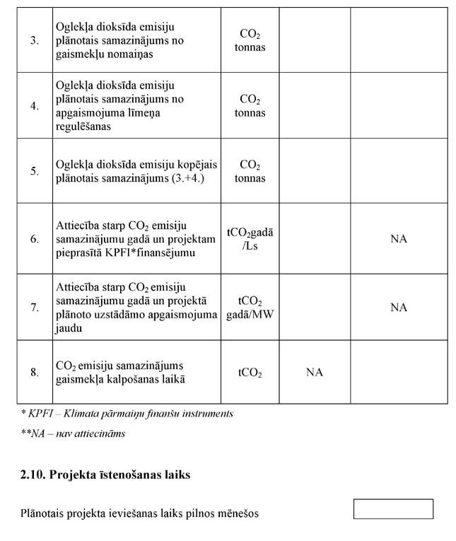 3. Projekta CO2 emisiju samazinājumu gadā (tCO2) aprēķina atbilstoši Ministru kabineta 2011.gada 24.maija noteikumu Nr.408 "Klimata pārmaiņu finanšu instrumenta finansēto projektu atklāta konkursa "Siltumnīcefekta gāzu emisiju samazināšana pašvaldību publisko teritoriju apgaismojuma infrastruktūrā" nolikums" 1.pielikumam.