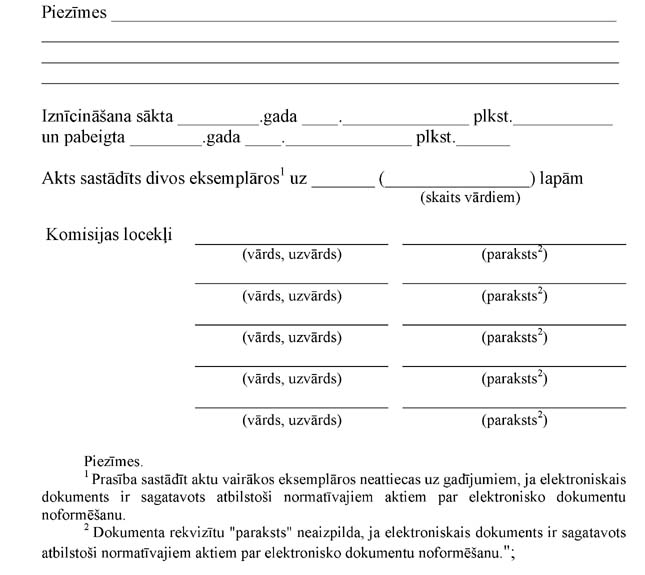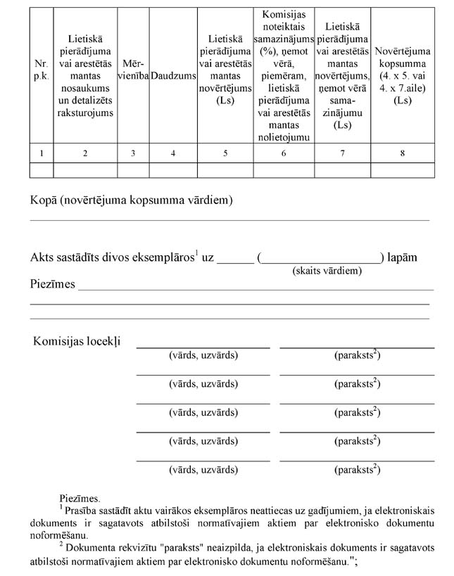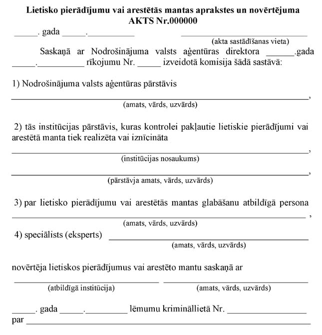 "15. Lietiskā pierādījuma novērtēšanas komisija novērtējumu ieraksta lietisko pierādījumu vai arestētās mantas aprakstes un novērtējuma aktā (2.pielikums). Aktu sagatavo divos eksemplāros (nav attiecināms uz elektroniska dokumenta veidā noformētiem novērtējumiem), to paraksta komisijas locekļi. Aktu nesagatavo, ja ir saņemts sertificēta vērtētāja novērtējums. Sertificētais vērtētājs lietiskā pierādījuma novērtējumu sagatavo divos eksemplāros (nav attiecināms uz elektroniska dokumenta veidā noformētiem novērtējumiem) un apliecina ar parakstu. Vienu lietisko pierādījumu aprakstes un novērtējuma aktu vai sertificēta vērtētāja novērtējumu pievieno krimināllietai, bet otru glabā aģentūrā un reģistrē lietisko pierādījumu vai arestētās mantas uzskaites reģistrā.";