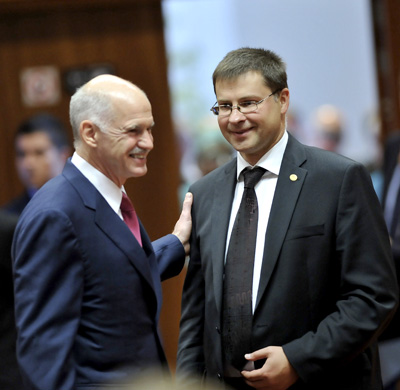 Laikā, kad Latvijā tauta svinēja tradicionālos Saulgriežu svētkus – Līgo vakaru un Jāņu dienu, Latvijas Ministru prezidents Valdis Dombrovskis 23. un 24.jūnijā Briselē piedalījās Eiropadomes sanāksmē, kur Eiropas Savienības valstu un valdību vadītāji apsprieda aktualitātes ekonomikas politikā, migrācijas un ārpolitikas jautājumos, kā arī meklēja risinājumus Grieķijas atbalstam. Attēlā: Latvijas Ministru prezidents Valdis Dombrovskis Eiropadomes sanāksmē Briselē, tiekoties ar Grieķijas premjerministru Georgu Papandreu Foto: VK |