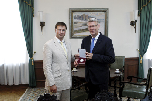 Vakar, 6.jūlijā, Valdis Zatlers pēdējo reizi kā Latvijas Republikas Valsts prezidents tikās ar Ministru prezidentu Valdi Dombrovski. Tikšanās laikā Valdis Zatlers Ministru prezidentam pasniedza Valsts prezidenta medaļu (attēlā) un pēc tikšanās preses konferencē atbildēja uz masu mediju pārstāvju jautājumiem (skat. 42.lpp.). Valda Zatlera prezidentūras termiņš beidzas šodien, 7.jūlijā, bet rīt, 8.jūlijā, pēc Valsts prezidenta svinīgā solījuma došanas pie sava amata pienākumu pildīšanas stāsies jaunais, astotais, Latvijas Republikas Valsts prezidents Andris Bērziņš Foto: VPK