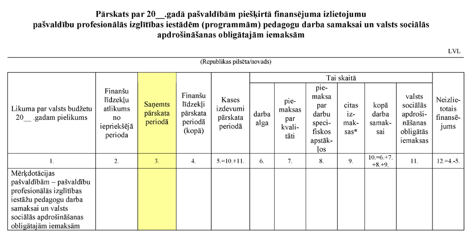 12. Pašvaldības sagatavo kārtējā gada pārskatu par mērķdotācijas izlietojumu atbilstoši normatīvajos aktos budžeta izdevumu klasifikācijas jomā noteiktajai atalgojuma klasifikācijai (pielikums) un iesniedz to elektroniski Izglītības un zinātnes ministrijā līdz normatīvajos aktos gada pārskata sagatavošanas jomā noteiktajam datumam.
