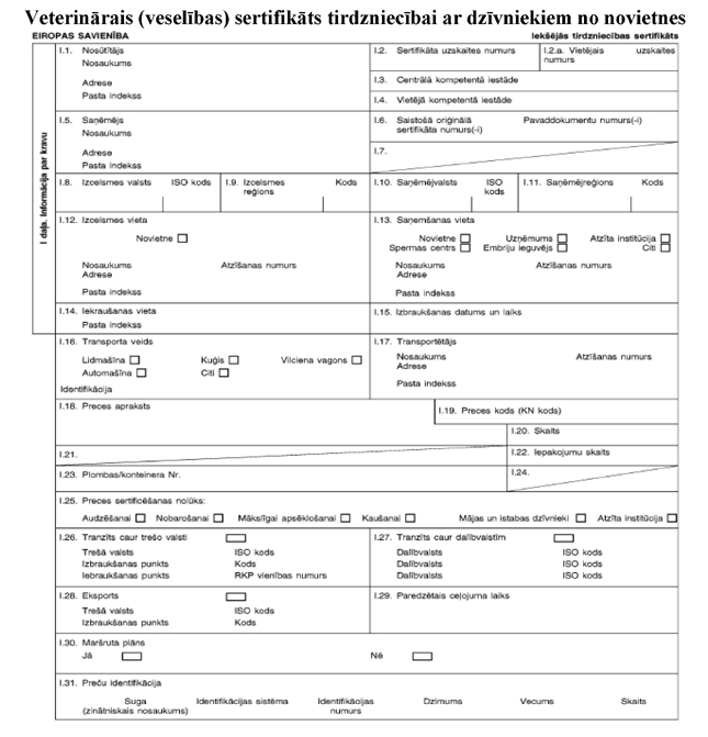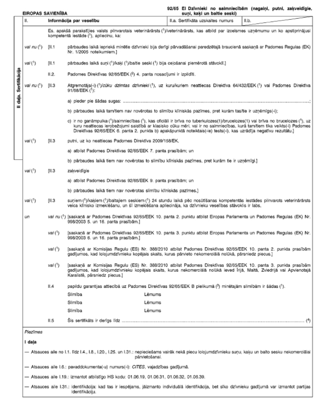 "5.1 Dzīvniekam, ko izved uz citu dalībvalsti, ir veterinārais veselības sertifikāts (3., 4. vai 5.pielikums), ko dienesta pilnvarots veterinārārsts izsniedzis saskaņā ar normatīvajiem aktiem par kārtību, kādā izsniedz dzīvnieku un dzīvnieku izcelsmes produktu veterināros (veselības) sertifikātus, un vispārīgajām veterinārajām prasībām dzīvnieku izcelsmes pārtikas produktu apritei."