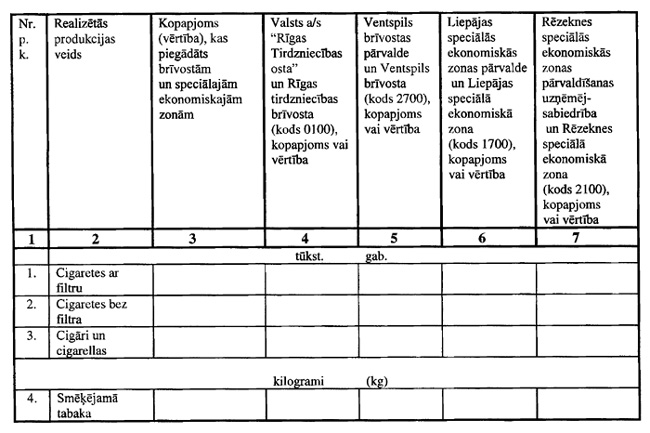 — 4.punktu izteikt šādā redakcijā: "4.ailē jāuzrāda akcīzes nodokļa likmes tabakai un tabakas izstrādājumiem pēc likuma "Par akcīzes nodokli tabakas izstrādājumiem" 7.panta pirmajā daļā noteiktajām likmēm (latos)."