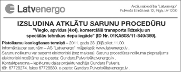 Konkursa piedāvājumu atvēršana notiks 2011.gada 1.augustā plkst. 10 Rīgā, Gogoļa ielā 3, 301. kab. Visi piedāvājumu dokumenti konkursam iesniedzami aizlīmētās aploksnes līdz 2011.gada 1.augustam plkst. 9.50 Rīgā, Turgeņeva ielā 14, 5.stāvā, 533. kab. (VAS "Latvijas dzelzceļš" Iepirkumu birojs) un no 9.55 līdz 10 Rīgā, Gogoļa ielā 3, 301. kab.