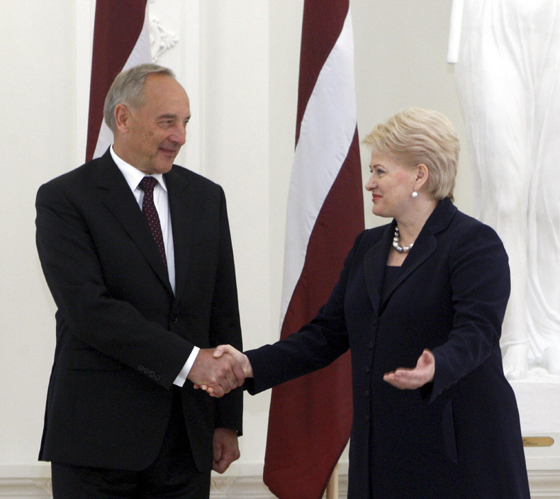 Vakar, 19.jūlijā, Latvijas Republikas Valsts prezidents Andris Bērziņš pēc stāšanās amatā uzturējās pirmajā oficiālajā ārvalstu vizītē – Lietuvas Republikā (pirmā darba vizīte – Igaunijas Republikā bija 12.jūlijā; skat. "LV" Nr.108, 13.07.2011.), kur tikās ar Lietuvas Republikas prezidenti Daļu Grībauskaiti (attēlā), Seima spīkeri Irēnu Degutieni, piedalījās ziedu nolikšanas ceremonijā Antakalnes kapsētā un vizītes noslēgumā piedalījās Daļas Grībauskaites rīkotajās pusdienās Foto: VPK |