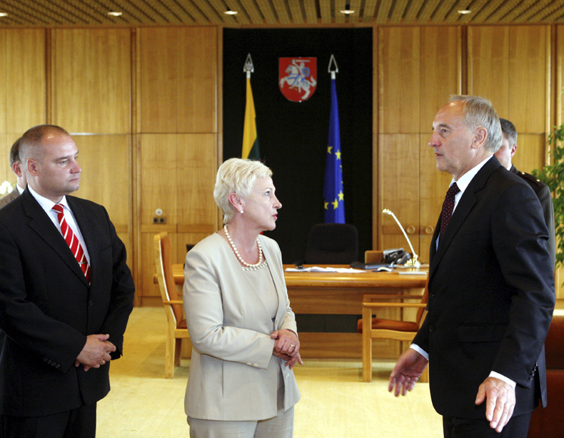 Lietuvas Republikas Seima spīkere Irēna Degutiene Latvijas Valsts prezidenta oficiālās vizītes laikā 19.jūlijā, iepazīstinot Latvijas Republikas Valsts prezidentu Andri Bērziņu un Valsts prezidenta kancelejas vadītāju Gundaru Daudzi ar Lietuvas likumdevēju darba telpām Foto: VPK |